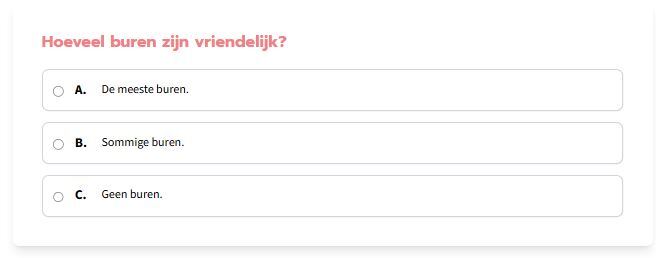 Aan hun antwoorden worden deelscores toegekend (bv. ‘De meeste buren’ = 3, ‘Geen buren’ = 0; ‘Er is een bureninitiatief dat vriendelijkheid actief stimuleert’ = 6; …).